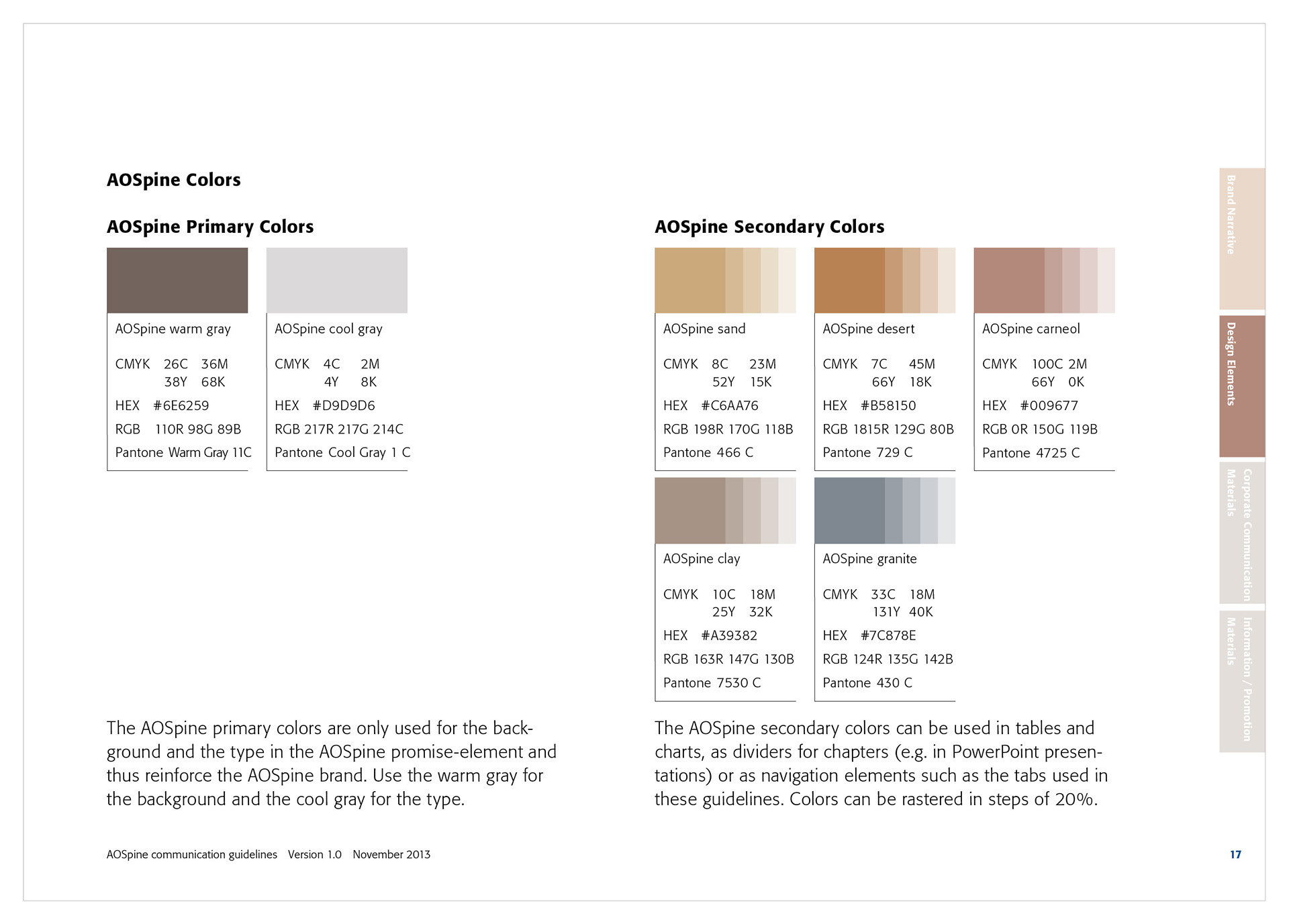 AOSpine requested guidelines for the definition and application of new colours, use of visual elements, definition of responsibilities of the different layers of communication, grid and measurements of the various sizes.