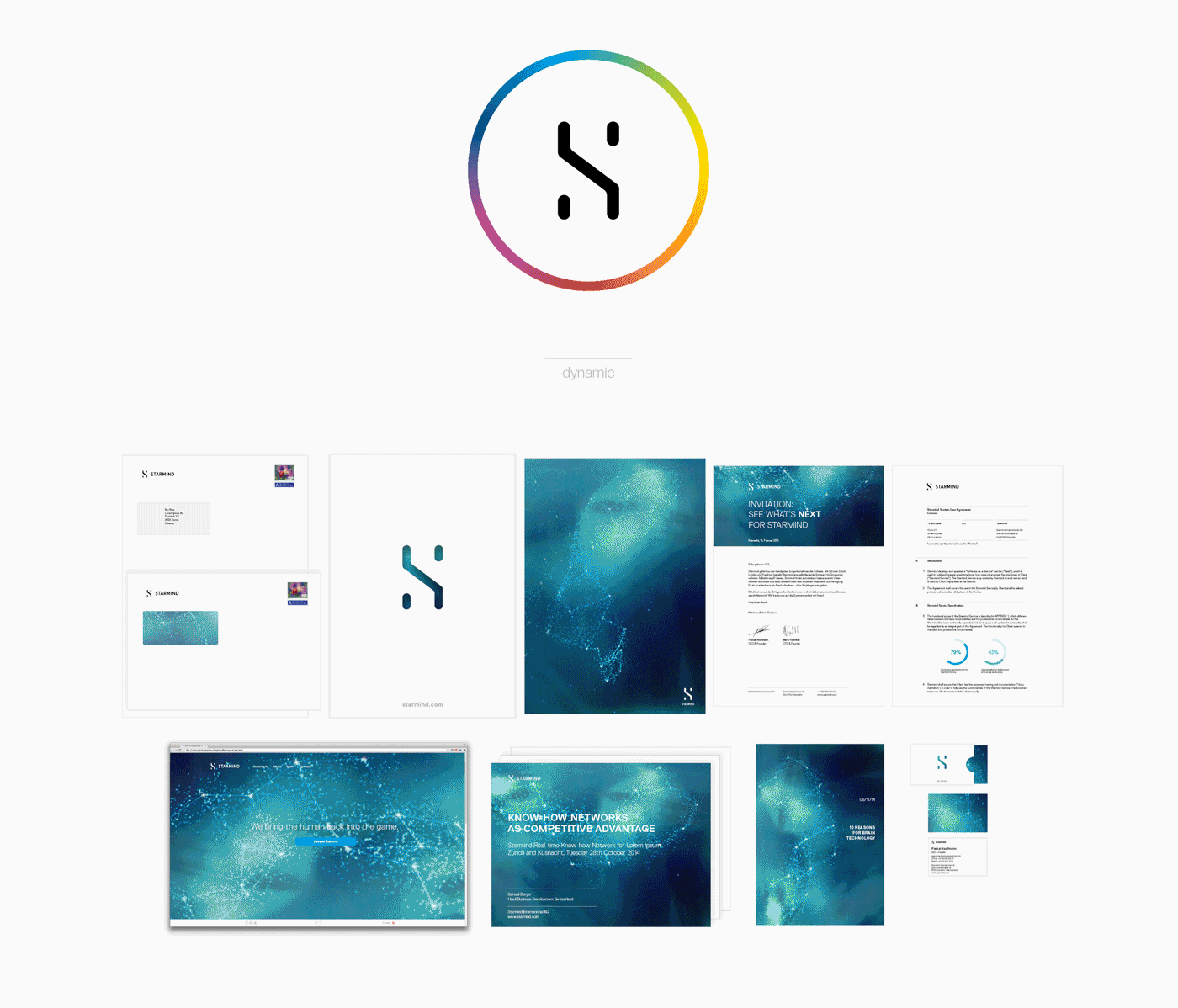 Additionally, the brand was designed to be dynamic, with key visuals generated from the galaxy 3D model able to change colour, shape and arrangement over time. Goal of the dynamic brand was to highlight the “doing things in a clever way” mindset, the young and cool attitude, and the technical skill of Starmind. The concept was rejected to not alienate the stakeholders.