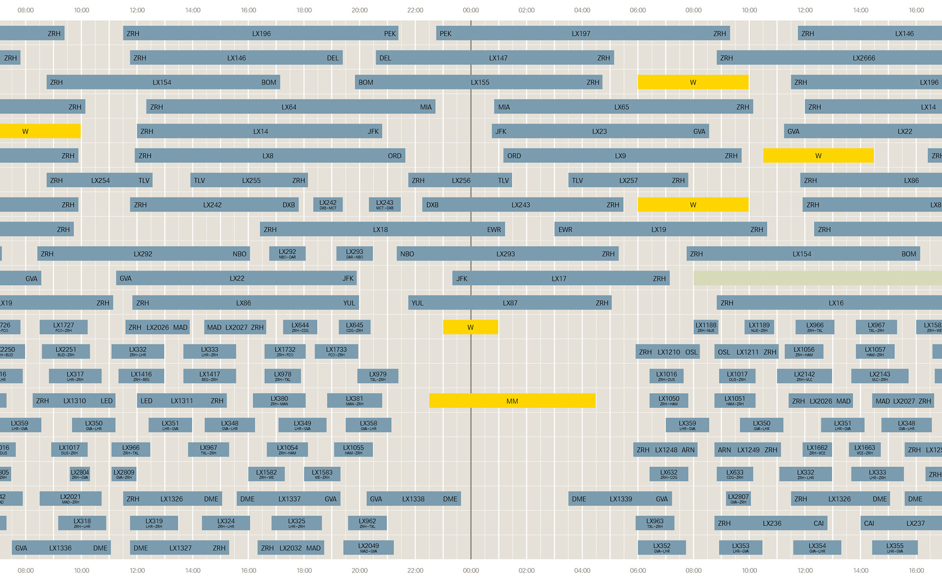 SWISS provided the flight tables of their “Juliet” and “India” lines: all these flights needed to be translated into modular magnetic signs. With delays, warnings, reserve, waiting and maintenance times, and both Juliet and India flights, about 250 magnetic signs were produced.
